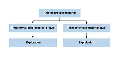 Ambidextrous leadership is a recently introduced term by scholars[1] to characterize a special approach to leadership that is mostly used in organizations.[2] It refers to the simultaneous use of explorative and exploitative activities by leaders. Exploration refers to search, risk taking, experimentation, and innovation in organizations, whereas exploitation has to do with refinement, efficiency, implementation, and execution.[3] Successful ambidextrous leaders must be able to achieve the appropriate mix of explorative and exploitative activities, unique for each organization, that will lead them to high firm performance outcomes.[4]