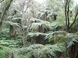 Of the documented species, some of the most ecologically and economically interesting are bigleaf mahogany, mountain pine, black walnut (no relation to the eastern North American tree of the same name), limachu, q'illu q'illu (Berberis bumaelifolia, also spelled khellu khellu), cebillo, bibosi, ambaiba, pacay, and clavo rojo. In the cloud-enveloped forests there are extensive patches of giant tree ferns. In addition, there are pachiuva, açaí palms and many species of endemic orchids.[8]