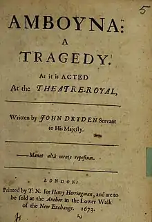 Amboyna, or the Cruelties of the Dutch to the English Merchants is a tragedy by John Dryden written in 1673. Its subject is the Amboyna massacre and the death of Gabriel Towerson that took place on Ambon Island in 1623. Dryden reportedly wrote the play in the short space of a month; he wanted to produce a topical piece, since England was at that time at war with the Dutch Republic.[1] It was dedicated to Lord Clifford, a member of the Cabal.