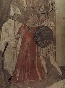 In this fresco, St. Louis is being greeted by Pope Boniface VIII as he is granted the title of Bishop of Toulouse. It was one in a series of frescoes painted with his brother, Pietro Lorenzetti, for Saint Francis of Assisi.[6] This fresco is particularly well known for its realistic sense of depth within an architectural environment, due to Lorenzetti's compellingly rendered three-dimensional space. Moreover, his figures are positioned in a very natural and familiar manner, introducing an awareness of naturalism in art. Lorenzetti's command of spatial perspective is thought to prefigure the Italian Renaissance. This fresco also shows his talent for depicting emotion, as we see on King Charles II’s face during the king’s witness to his son’s rejection of material goods and power.[7] Such attention to detail possibly indicates an intellectual curiosity. Giorgio Vasari, in Lives of the Most Excellent, Painters, Sculptors and Architects wrote of Lorenzetti's intellectual abilities, saying that his manners were "more those of a gentleman and philosopher than those of an artist".[8]
