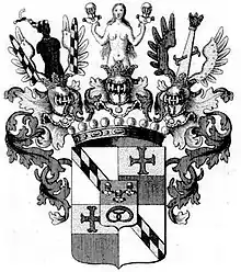 In 1705, he married Eleonore Magdalena Wilhelmina (1687–1727), daughter of Ernest William, Count of Bentheim-Tecklenburg-Steinfurt.[6][7] This marriage gave him access to the higher ranks of the European nobility. In respect of the merits of his uncle General Damian Hugo von Virmont during the Great Turkish War, Emperor Joseph I on 8 September 1706 raised both him and his uncle to Imperial Counts.[8] Following the fashion of the time his family name was altered from von Viermund to the frenchified von Virmont. His wife Eleonore died in 1727.[6][8] Soon after his two children Maria Isabella Augusta Ernestine (1706–1728) and Joseph Damian Max (1707–1730) also died.[6]