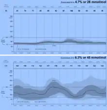 Since 2006, AGP analysis was applied to CGM-based studies enabling the first graphically depicted diurnal patterns of individuals with normal glucose metabolism (essentially without diabetes).[8][9][10][11] ″In recognition of this work the Helmsley Trust awarded a grant to establish AGP as the standard reporting system for CGM and sponsored a special symposium of experts who, after thorough review agreed.[12] Subsequently, other groups reviewed AGP and came to a similar conclusion.[13][2][14][15]