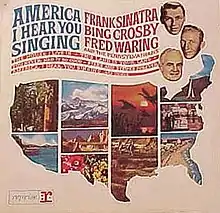 America, I Hear You Singing is an album recorded and released in 1964 by American singer Frank Sinatra with Bing Crosby and Fred Waring's Pennsylvanians.[2] The album is a collection of patriotic songs, recorded as a tribute to the assassinated president John F. Kennedy. The artists would collaborate again for the album 12 Songs of Christmas, released later the same year. An abridged version of the album was reissued as This Land Is Your Land (H 30931) on Columbia's budget label Harmony in 1971.