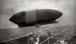 After another 33 hours,[9] and having now traveled a total distance of 1,370 miles (2,200 km) from launching, they sighted the Royal Mail steamship Trent west of Bermuda. After attracting the ship's attention by a signaling lamp using Morse code, Irwin made the first aerial distress call by radio. The crew, and mascot cat Kiddo, got into the lifeboat and, after opening the gas valves on the airship, abandoned the America. The airship drifted out of sight and was never seen again. Trent, having barely avoided running down the lifeboat in a high crosswind, was able to rescue the crew and returned them to New York.[10] The first successful aerial crossings of the Atlantic came nine years later.