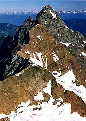 American Border Peak is a mountain just south of the Canada–United States border, in the North Cascades of Washington state, with a corresponding sister peak, Canadian Border Peak, just north along a col connecting to it across the border.[5] It is located within the Mount Baker Wilderness, part of the Mount Baker-Snoqualmie National Forest, near North Cascades National Park. It is notable for its large, steep local relief; however its somewhat rotten rock makes it less appealing to climbers than nearby Slesse Mountain.[4]