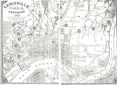 Louisville's fortifications for the American Civil War were designed to protect Louisville, Kentucky, as it was an important supply station for the Union's fight in the western theater of the war. They were typically named for fallen Union officers; usually those that served in the Army of the Ohio. The inspiration for building the forts came in October 1862, when Confederate forces engaged in their largest attack in Kentucky, only to be halted at the Battle of Perryville. Construction began in 1863, going at a slow pace until Confederate forces marched on Nashville, Tennessee, in the autumn of 1864. This caused General Hugh Ewing to demand from the city to force both military convicts and local "loafers" to help build the fortifications. Due to military engineers being needed on the front lines, the fortifications in Louisville were designed by civilian assistant engineers, as were the ones in Cincinnati, Ohio. Louisville was never endangered, so the guns never fired, save for salutes.[1]