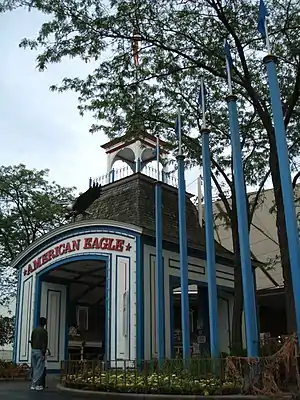 The tent that housed the American Eagle queue area from 1981 to 2006 was used as a circus tent from 1976 to 1980. In 2007, it was converted into a children's area named KIDZOPOLIS (originally Wiggles World). The new entrance is located to the right of KIDZOPOLIS, utilizing part of the entry building for the adjacent Dare Devil Dive skycoaster, which opened in 1997.[4] The old entrance was demolished in 2006. The original bald eagle that was on the roof of the old entrance is being used again on the current entrance.[5]