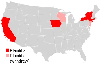 One group of plaintiffs was composed of the City of New York and eight states, including: California, Connecticut, Iowa, New Jersey, New York, Rhode Island, Vermont, and Wisconsin. However, New Jersey and Wisconsin eventually withdrew from the case. The other group of plaintiffs included three nonprofit land trusts: The Open Space Institute, the Open Space Conservancy, and the Audubon Society of New Hampshire.[2]
