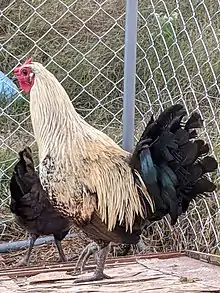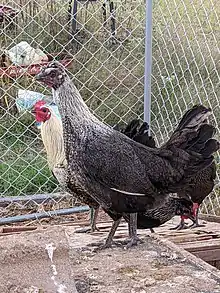The American Long Crower is an American breed of chicken developed in the 2000s. It was named for its exceptional crow that regularly lasts more than 10 seconds. It originated as a composite of the Turkish Denizli chicken and other rare long-crowing breeds. It is mainly a novelty breed, but can serve as dual-purpose kept for its brown eggs and its yellow-skinned meat. It is rare, with fewer than a dozen flocks nationwide. It is usually birchin patterned grey color variants. It is sometimes referred to as McCallum's Long Crower.[1]
