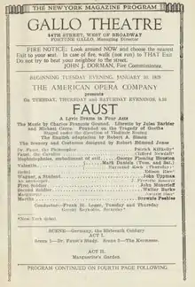 During January and February 1928 the American Opera Company brought seven weeks of opera to Broadway at New York's Gallo Opera House, including a notable adaptation of Faust with a new libretto by music critic for The New Yorker Robert A. Simon and sets by designer Robert Edmond Jones.[9]