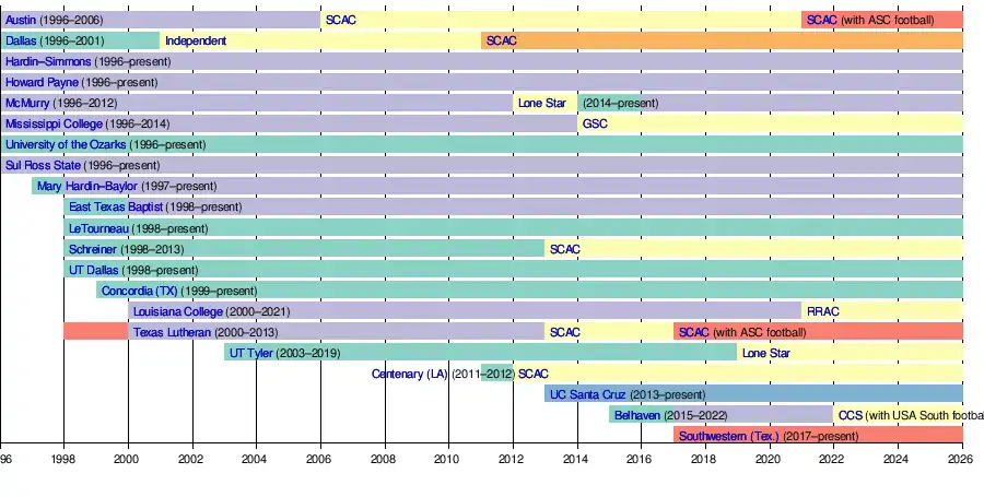 - Austin College re-joined the conference for football only, effective the 2021 fall season (2021–22 school year); but was a full member from 1995–96 to 2005–06 before leaving for the Southern Collegiate Athletic Conference (SCAC).