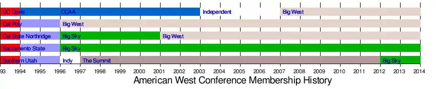 The American West Conference (AWC) was a college athletic conference in the United States from 1993 to 1996. It consisted of schools in California and Utah. The charter members of the conference were California Polytechnic State University; California State University, Northridge; California State University, Sacramento; the University of California, Davis; and Southern Utah University.