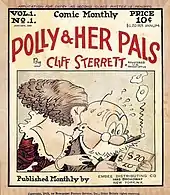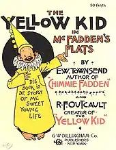 The G. W. Dillingham Company published the first known proto-comic-book magazine in the US, The Yellow Kid in McFadden's Flats, in 1897. A hardcover book, it reprinted material—primarily the October 18, 1896, to January 10, 1897, sequence titled "McFadden's Row of Flats"—from cartoonist Richard F. Outcault's newspaper comic strip Hogan's Alley, starring the Yellow Kid. The 196-page, square-bound, black-and-white publication, which also includes introductory text by E. W. Townsend, measured 5 by 7 inches (130 mm × 180 mm) and sold for 50 cents. The neologism "comic book" appears on the back cover.[10] Despite the publication of a series of related Hearst comics soon afterward,[10] the first monthly proto-comic book, Embee Distributing Company's Comic Monthly, did not appear until 1922. Produced in an 8+1⁄2-by-9-inch (220 mm × 230 mm) format, it reprinted black-and-white newspaper comic strips and lasted a year.[10][11]
