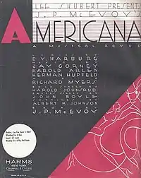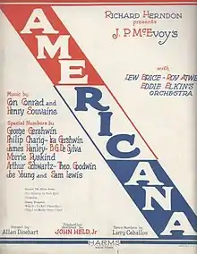 Americana is a musical revue in two parts, with book and lyrics by J. P. McEvoy, and music by Con Conrad with additional numbers by George Gershwin, Ira Gershwin, Philip Charig, James Hanley, B. G. DeSylva, Morrie Ryskind, Arthur Schwartz, Theo Goodwin, Joe Young, and Sam Lewis. The show was presented by Richard Herndon at the Belmont Theatre (121 W. 48th Street, New York, NY), and, after many postponements, opened July 26, 1926.[1] The show was staged by Allan Dinehart with dance numbers by Larry Ceballos. The production was designed by John Held, Jr. It ran for 224 performances, closing in February 1927.[2] The cast headlined Lew Brice, Roy Atwell, Betty Compton, Charles Butterworth and the Eddie Elkins Orchestra.[2] The New York Times review called it a "witty, ingenious and sophisticated evening of fun-making, it made up in its abundant humor for more than it lacked in some other departments."[3] The other departments referred to were lack of chorus girls and opulent settings.