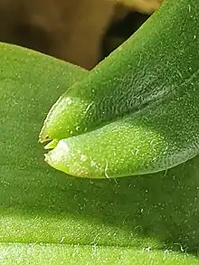 Amesiella philippinensis is a species of orchid endemic to the Island of Luzon in the Philippines.[1][2][3] Like Vanda falcata it was mistaken as an Angraecum species, due to the white, long-spurred flowers. The plant produces rounded leaces up to 5 cm in length. Three or four white, fragrant flowers of 3 cm in width are produced on short inflorescences. The labellum is yellow in the throat.[4] It occurs at lower altitudes than Amesiella monticola and has a shorter spur.[5]