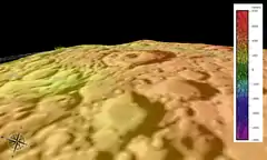 Computer-generated image of the crater Amici (bottom center), colorized to show altitude (see key on right).