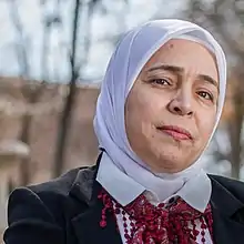 Amina Khoulani is a Syrian survivor of Assad's prisons who gained exile in Manchester in the UK in 2014. Since then she has campaigned for other prisoners and helped to support their families. She was chosen as an International Woman of Courage in March 2020.[1]