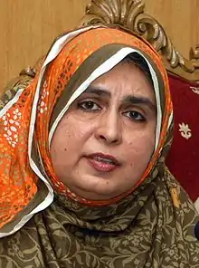 Amina Masood Janjua, (Urdu: آمنہ مسعود جنجوعہ): born 28 April 1964, is a Pakistani activist known for her work against enforced disappearance in Pakistan. She is the chairperson of rights group Defence of Human Rights Pakistan.[1] Her career in activism started when her husband Masood Ahmed Janjua disappeared on 30 July 2005. Apart from enforced disappearances, her work includes providing legal support to prisoners in foreign countries, arranging financial support to the families of victims of enforced disappearance and eradication of torture from jails and detention centers. She appears regularly on local and foreign media as the spokesperson of missing persons and occasionally contributes articles in Urdu and English dailies of the country.