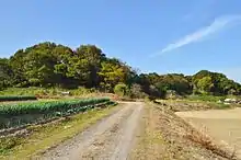 The Amino Chōshiyama Kofun is a zenpō-kōen-fun (前方後円墳), which is shaped like a keyhole, having one square end and one circular end, when viewed from above. It is located on a hill at the mouth of the Fukuta River that flows through the Tango Peninsula into the Sea of Japan. It dates from the middle of the Kofun period, or the end of the 4th century to the beginning of the 5th century. The surrounding area has a number of Yayoi period and Kofun period remains. The tumulus is orientated to the north-northeast and has an overall length of 201 meters, making it one of the largest on the Sea of Japan coast. The surface of the mound was covered in white fukiishi, and both cylindrical and figurative haniwa have been found. Among the haniwa, fragments of a type specific to the Tango region have been found. In addition, the tumulus is surrounded by incomplete moats with a width of 17 to 25 meters on east, south and west sides. As no excavation has been conducted, the details of the burial chamber are not clear. [2]
