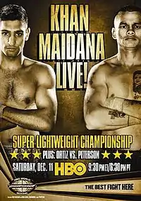 Light welterweight titlist Amir Khan and interim titlist Marcos Maidana reached an agreement to meet on December 11, 2010.[1] The bout was for Khan's WBA Light Welterweight Title, which Khan successfully defended, winning via unanimous decision. The bout was awarded Fight of the Year by the Boxing Writers Association of America.[2]