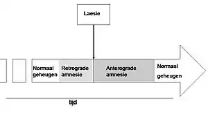 Amnesia is a deficit in memory caused by brain damage or disease,[1] but it can also be caused temporarily by the use of various sedatives and hypnotic drugs. The memory can be either wholly or partially lost due to the extent of damage that was caused.[2] There are two main types of amnesia: retrograde amnesia and anterograde amnesia. Retrograde amnesia is the inability to retrieve information that was acquired before a particular date, usually the date of an accident or operation.[3] In some cases the memory loss can extend back decades, while in others the person may lose only a few months of memory. Anterograde amnesia is the inability to transfer new information from the short-term store into the long-term store. People with anterograde amnesia cannot remember things for long periods of time. These two types are not mutually exclusive; both can occur simultaneously.[4]