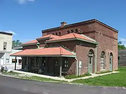 The building consists of a small brick passenger/cargo depot with a large, two-story repair substation at the rear. It has Romanesque Revival and Queen Anne style design elements. The passenger depot section is topped by a series of red clay tile hipped roofs.