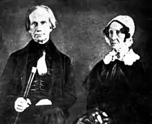 Amos Kendall was markedly shy. In part, this was due to the lack of social graces taught to him in his childhood and adolescence. He did not actively participate in social gatherings until he moved to Groton, Massachusetts, in 1811. In Groton, he fell in love with 16-year-old Eliza, the sister of a prominent Boston family of merchants. She refused his attentions (as she was too young to marry), and Kendall wooed her older sister, Mary. But the loss of his legal apprenticeship and subsequent move to Kentucky in 1813 ended their relationship.[31]