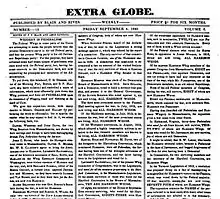 Kendall was appointed U.S Postmaster General on May 1, 1835. During his time in office, he worked to eliminate corruption in the Post Office Department.[36] He also manipulated operations of the Post Office Department so that western newspapers (which tended to support Jackson) were delivered faster and received better service than eastern ones. Despite having no legal basis for his action, he also allowed postal officials in the Deep South to refuse to deliver abolitionist literature.[59] Suffering from extreme poor health,[60] he resigned as Postmaster General effective May 18, 1840.[61] John Quincy Adams, a bitter foe of both Jackson and Van Buren, confided to his diary in December 1840 that he believed both men had been "for twelve years the tool of Amos Kendall, the ruling mind of their dominion."[62] Kendall wrote extensively for the Washington Extra Globe newspaper in the summer and fall of 1840 in an unsuccessful effort to boost Van Buren's chances for re-election.[36]
