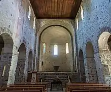 The first church on the site was built in the early Romanesque style in the 6th century.[3] Like the castle, the former collegiate church of St. Mauritius was built in the 10th century. The Ottonian three-aisle church was built from stone scavenged from the ruins of Aventicum on the foundations of the earlier church.[4] According to tradition, the stift or donation that supported the church was made in the 10th century by the King of Burgundy Rudolph II. It was one of the twelve churches that he founded around Lake Thun. Around 1210, the 10th century church was modified with the construction of the crypt and renovation of the south aisle. The church is first mentioned in a record in 1228.[3] Around 1300, the interior of the church was covered with murals including the still visible painting of Saint Christopher on the north wall.[5] The southern side apse was demolished and a Romanesque bell tower was added between 1345 and 1486.