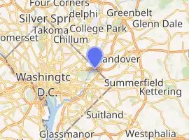On February 26, 1903, the Commissioners of the District of Columbia gave their approval for the Baltimore and Potomac Railroad (B&P, then controlled by the Pennsylvania Railroad [PRR]) to build a more direct line from Baltimore to the District of Columbia.[1] The new route would be called the Magruder Branch (because it crossed the Magruder Branch, a stream which is a tributary of the Anacostia River). It would largely replace the local section of the Washington City Branch, which crossed the Anacostia 3 miles (4.8 km) to the south. The Magruder Branch would connect the new Union Station with the PRR Magruder Station in Landover, Maryland (a major hub for the railroad).