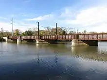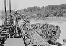The clearing of the wreck and reconstruction of the bridge was itself the cause of several injuries. A dredge, several cranes, and a pile-driver were brought on site to shore up the bridge and assist with the removal of debris and wreckage.[10][11] Two men were hurt on August 24 by debris and cranes attempting to lift the locomotive from the water.[7] Two days later, a man was killed when a telephone pole on the bridge toppled over onto him.[10] The same day, the pile-driver toppled over into the river as well.[10] Another worker was injured on August 27 after being hit by a boom.[11] At least one wrongful-death lawsuit was filed.[12] A temporary single-track span was erected on August 28, and traffic over the bridge resumed shortly thereafter.[13]