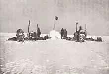 The party made good initial progress, travelling around 15 nautical miles (28 km) each day. The dogs ran so hard that several from the strongest teams were detached from the traces and secured onto the sledges to act as ballast.[113] In their wolf-skin and reindeer-skin clothing the men could cope with the freezing temperatures while they kept moving, but when they stopped they suffered, and barely slept at night. The dogs' paws became frostbitten.[111] On 12 September, with temperatures down to −56 °C (−69 °F), the party halted after only 4 nautical miles (7.4 km) and built igloos for shelter.[113] Amundsen now recognised that they had started the march too early in the season, and decided they should return to Framheim. He would not risk the lives of men and dogs for reasons of stubbornness.[114] Johansen, in his diary, wrote of the foolishness of starting prematurely on such a long and historic journey, and of the dangers of an obsession with beating the English.[115]