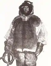 The party's ski boots, specially designed by Amundsen, were the product of two years' testing and modification in search of perfection.[54] The party's polar clothing included suits of sealskin from Northern Greenland, and clothes fashioned after the style of the Netsilik Inuit from reindeer skins, wolf skin, Burberry cloth and gabardine.[55] The sledges were constructed from Norwegian ash with steel-shod runners made from American hickory. Skis, also fashioned from hickory, were extra long to reduce the likelihood of slipping into crevasses.[56] The tents—"the strongest and most practical that have ever been used"[57]—had built-in floors and required a single pole. For cooking on the march, Amundsen chose the Swedish Primus stove rather than the special cooker devised by Nansen, because he felt the latter took up too much space.[58]