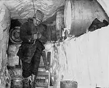 The sun set over Framheim on 21 April, not to reappear for four months.[103] Amundsen was mindful of the boredom and loss of morale that had blighted the Belgica expedition's winter in the ice, and although there was no possibility of sledging he ensured that the shore party kept busy.[104] One urgent task was to improve the sledges, which had not worked well during the depot journeys. In addition to those chosen specifically for the expedition, Amundsen had brought along several sledges from Sverdrup's 1898–1902 Fram expedition, which he now thought would be better suited to the task ahead. Bjaaland reduced the weight of these older sledges by almost a third by planing down the timber, and also constructed three sledges of his own from some spare hickory wood. The adapted sledges were to be used to cross the Barrier, while Bjaaland's new set would be used in the final stages of the journey, across the polar plateau itself.[105] Johansen prepared the sledging rations (42,000 biscuits, 1,320 tins of pemmican and about 220 pounds (100 kg) of chocolate),[106] while other men worked on improving the boots, cooking equipment, goggles, skis and tents.[107] To combat the dangers of scurvy, twice a day the men ate seal meat that had been collected and frozen in quantities before the onset of winter. The cook, Lindstrøm, supplemented the vitamin C intake with bottled cloudberries and blueberries, and provided wholemeal bread made with fresh yeast, rich in B vitamins.[108][109]