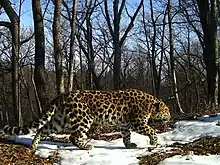 The first camera trap image of an Amur leopard in northeastern China was taken in 2010 in Hunchun National Nature Reserve, in the Changbai Mountains of Jilin and Heilongjiang Provinces.[29] This habitat consists of broadleaved and conifer forests at elevations of 600–1,200 m (2,000–3,900 ft), where the annual average temperature is about 1.5 °C (34.7 °F).[30] In this area, leopards were repeatedly photographed by camera traps set up between January 2013 and July 2014 covering up to 4,858 km2 (1,876 sq mi).[31][32][33]
