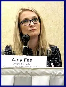 Amy Fee (born 1981/1982)[1] is a Canadian politician, who was elected to the Legislative Assembly of Ontario in the 2018 provincial election.[2] She represents the riding of Kitchener South—Hespeler as a member of the Progressive Conservative Party of Ontario.