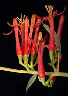 Its leaves are flat and opposite (sometimes appearing alternate).[7] Its inflorescence is a simple umbel with 3-6 flowers, on a stem.[7] Flowering from January to December, its erect flowers[8] shade from pinky-red to an orange-red.[5] The yellow stamens do not project beyond the corolla.[8] The mature buds have six ribs.[8]