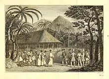 During Wallis' Dolphin expedition, there were no dedicated artists on board. To illustrate the first encounter with the people of Tahiti, the anonymous artist of the illustration Captain Wallis, on his arrival at O'Taheite, in conversation with Oberea the Queen fell back on interpreting Hawkesworth's text and on using oriental imagery from other places. They may have been inspired by engravings in François Valentijn's 1724–1726 Oud en Nieuw Oost-Indiën (Old and New East India).[23]