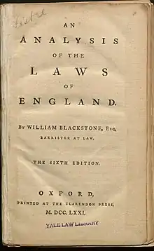 An Analysis of the Laws of England is a legal treatise by British legal professor William Blackstone. It was first published by the Clarendon Press in 1756. A Fellow of All Souls College, Oxford, and a lecturer there, on 3 July 1753 Blackstone announced his intentions to give a set of lectures on the common law — the first lectures of that sort in the world.[1] A prospectus was issued on 23 June 1753, and with a class of approximately 20 students, the first lecture series was completed by July 1754. Despite Blackstone's limited oratory skills and a speaking style described by Jeremy Bentham as "formal, precise and affected", Blackstone's lectures were warmly appreciated.[2] The second and third series were far more popular, partially due to his then unusual use of printed handouts and lists of suggested reading. These show Blackstone's attempts to reduce English law to a logical system, with the division of subjects later being the basis for his Commentaries.[3][4] The lecture series brought him £116, £226 and £111 a year respectively from 1753 to 1755 — a total of £72,000 in 2022 terms.[5] Seeing the success of this publication, Blackstone was induced to write An Analysis of the Laws of England, a 200-page introduction to English law, which was first published in 1756 by the Clarendon Press.[6]