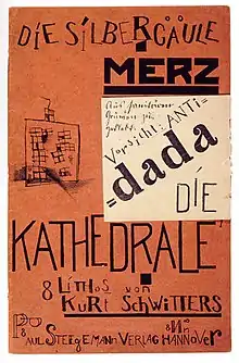 The title of Schwitters's book, Die Kathedrale, reflects the Expressionists' embrace of the Gothic cathedral as an emblem of unification in the arts. The white square of paper on the cover, part of a wraparound seal added by Schwitters, declares, "Beware: Anti-Dada."[9]