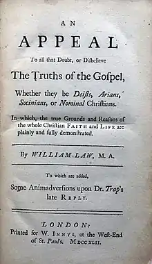 An Appeal to all that Doubt or Disbelieve the Truths of the Gospel, whether they be Deists, Arians, Socinians, or nominal Christians, or short An Appeal was written by William Law in 1742. Law lived in the Age of Enlightenment centering on reason in which there were controversies between Catholics and Protestants, Deists, Socinians, Arians etc. which caused conflicts that worried him. The Appeal was heavily influenced by the works of the seventeenth-century German philosopher, Lutheran theologian and mystic writer Jakob Boehme.