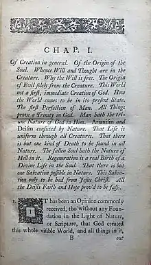 Of creation in general. Of the origin of the soul. Whence will and thoughts are in the creature. Why the will is free. The origin of evil solely from the creature. This world not a first, immediate creation of God. How the world comes to be in its present state. The first perfection of Man. All things prove a Trinity in God. Man hath the triune nature of God in him. Arianism and Deism confuted by nature. That life is uniform through all creatures. That there is but one kind of death to be found in nature. The fallen soul hath the nature of hell in it. Regeneration is a real birth of a divine life in the soul. That there is but one salvation possible in nature. This salvation only to be had from Jesus Christ. All the deist’s faith and hope proved to be false.[9]