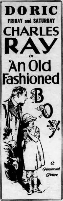 An Old Fashioned Boy is a surviving 1920 American silent comedy romance film directed by Jerome Storm and starring Charles Ray. Famous Players-Lasky produced along with producer Thomas Ince. It was released by Paramount Pictures.[1][2]