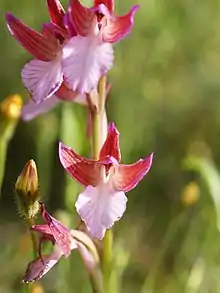 Anacamptis is a genus of flowering plants in the orchid family (Orchidaceae); it is often abbreviated as Ant in horticulture. This genus was established by Louis Claude Richard in 1817; the type species is the pyramidal orchid (A. pyramidalis) and it nowadays contains about one-third of the species placed in the "wastebin genus" Orchis before this was split up at the end of the 20th century,[1] among them many that are of hybrid origin. The genus' scientific name is derived from the Greek word anakamptein, meaning "to bend backwards".