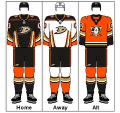 The team's colors were purple and jade until the change of ownership in 2006. At this point, they became orange, black and gold, with white in place of black for the away jersey. The only exception is the alternate jersey, which is mostly orange. Orange, which has become one of the team's primary colors, is in reference to Orange County, where Anaheim is located.[46]