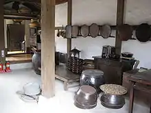This room is the sanctuary for the head woman. The floor of the room is covered with laminate paper covered with bean oil (장판지마감), or a reed mat covering the soil floor of the ondol. There may also be doors leading to the attic on the front part of the kitchen, and the lower part of the floor is covered with a thin blanket.[2]