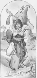 Bivoj is a Czech legendary hero, who was supposed to catch a wild boar by his ears at Kavčí Mountain, and take him on his back to Libušín Castle. He was to marry Kazi for this act.