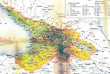 Diauehi, a tribal union of early-Georgians, first appear in written history in the 12th century BC.[8][9][10][11][12][13][14][15] Archaeological finds and references in ancient sources reveal elements of early political and state formations characterized by advanced metallurgy and goldsmith techniques that date back to the 7th century BC and beyond.[15] Between 2100 and 750 BC, the area survived the invasions by the Hittites, Urartians, Medes, Proto-Persians and Cimmerians. At the same period, the ethnic unity of Proto-Kartvelians broke up into several branches, among them Svans, Zans/Chans and East-Kartvelians. That finally led to the formation of modern Kartvelian languages: Georgian (originating from East Kartvelian vernaculars), Svan, Megrelian and Laz (the latter two originating from Zan dialects). By that time Svans were dominant in modern Svaneti and Abkhazia, Zans inhabited modern Georgian province of Samegrelo, while East-Kartvelians formed the majority in modern eastern Georgia. As a result of cultural and geographic delimitation, two core areas of future Georgian culture and statehood formed in western and eastern Georgia by the end of the 8th century BC. The first two Georgian states emerged in the west known as the Kingdom of Colchis and in the east as the Kingdom of Iberia.