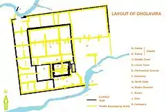 At Dholavira, possible funerary architecture was found surrounding a dried up lake and consists of tumuli, sometimes resembling hemispherical domes, constructed using mud bricks or stone slabs. The plan of the base of tumulus is in the shape of a spoked wheel with a chamber in the centre.[12]