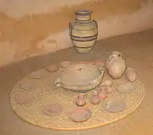 Chickpea cultivation dates back to the Bronze Age (3300 – 1200 BCE)[8] and grapes and olives became important crops in the hill country. Wine and oil were traded for wheat with the cities on the coastal plain, and for meat and skins with semi-nomadic herders. Wine and carobs were also exported to Egypt during this period. At Arad in the northern Negev, the remains of wheat, barley and legumes have been found, along with stone-lined storage pits for grain from this period. Pottery was imported from Cyprus and Mycenae in Greece for the first time, probably for use as good-quality tableware. After the Bronze Age collapse of urban culture, there was an increase in herding and the disappearance of smaller agricultural communities.[7]